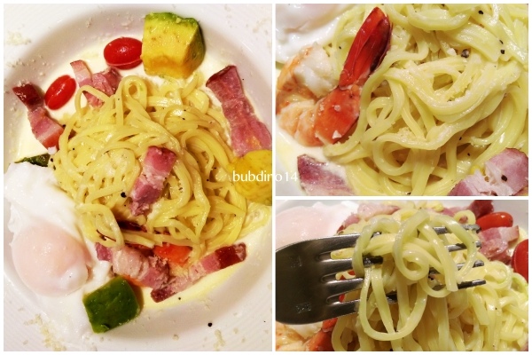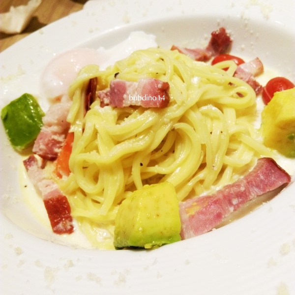 來了!厚切培根蛋奶麵,選了生麵,可是我不太知道差別在哪"