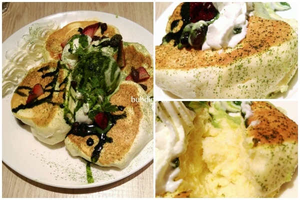 服務生說他們的鬆餅比較像舒芙蕾,蓬鬆蓬鬆的,進一看感覺很多泡泡噗滋噗滋的感覺:9
